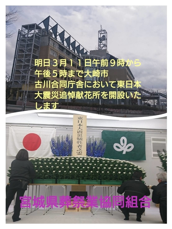 2018-03-10 明日、3月11日は「みやぎ鎮魂の日」です 活動報告 宮城県葬祭業協同組合では東日本大震災の犠牲とならせた方々のご冥福を祈り「みやぎ鎮魂の日」を各会場にてお手伝いしております。【宮城県広報課HPおよびfacebookより抜粋】【東日本大震災から7年】 3月11日、東日本大震災から7年を迎えます。 県は、東日本大震災で亡くなられた方々に追悼の意を表し、震災の記憶を風化させることなく後世に伝えるとともに、震災からの復興を誓う日として、3月11日を「みやぎ鎮魂の日」と定めています。 本日は、県庁をはじめ、県内の市町村でも追悼式が開催されており、村井知事も追悼式に参列します。 皆さまには、発災時刻である午後2時46分に1分間の黙祷を捧げられますようお願いします。「みやぎ鎮魂の日」に係る県,関係機関・団体等の取組について [PDFファイル/138KB]「みやぎ鎮魂の日」に係る市町村等の取組について [PDFファイル/260KB] 宮城県では,3月11日を「みやぎ鎮魂の日」と定め,亡くなられた方々を追悼するため,以下のとおり県内に追悼献花台と記帳所を設置します。 皆さまにおかれましては,東日本大震災の発生時刻である午後2時46分に黙とうを捧げられますようお願いします。 東日本大震災で亡くなられた方々の追悼について(危機対策課)〇各組合員の会館におきましても献花場を設営しております。〇大崎市古川合同庁舎の準備の様子〇大河原合同庁舎